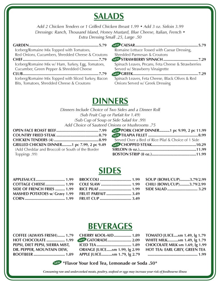 Sirloin steak with choice of temp: medium to well done. Select two sides from applesauce, salads, hashbrowns, various mashed potatoes, rice pilaf, or veggies.